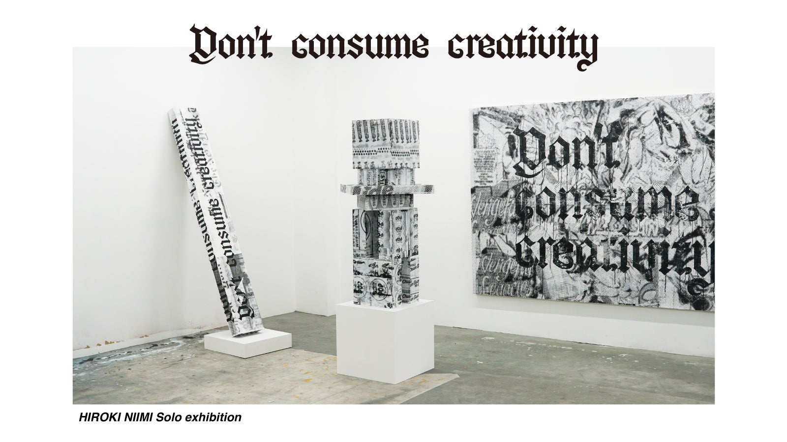 本展覧会では、「クリエイティブを消費するな」というキャッチコピーをAIによって翻訳、これからの時代で一番クリエイティブを殺していくことが予見されるそうしたその言葉をモチーフに採用することで、「クリエイティブの消費」に対する皮肉を表現します。