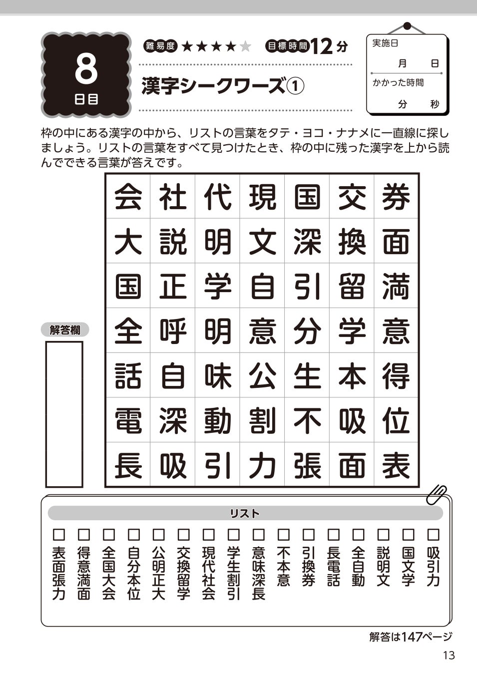 漢字パズル、計算パズル、まちがいさがしなど、チャレンジする問題によって鍛えられる脳の機能もさまざま。丸1冊とおして取り組むことで、語彙力、計算力、ワーキングメモリ、想像力、空間認知力などをバランスよく鍛えることができます。答えがわからなかったら解答を見ながらでもかまいません。楽しく続けることを目標にしましょう。