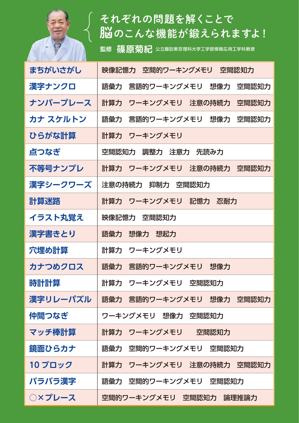 本書の監修は公立諏訪東京理科大学教授で脳科学博士の篠原菊紀氏。専門は脳科学と応用健康科学。さまざま発売されているパズル関連の書籍などだけでなく、TV番組「クイズ!脳ベルSHOW」の監修も行ってます。