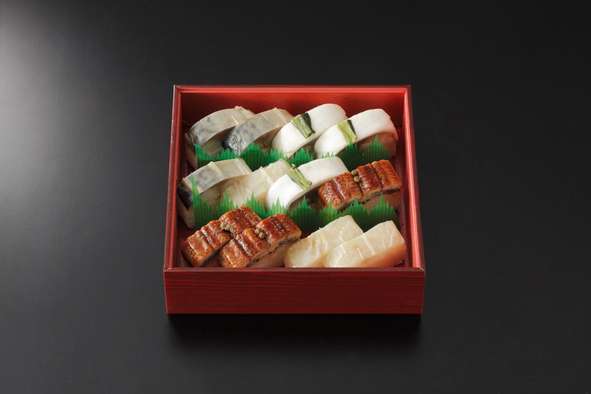 鯖寿し、甘鯛昆布〆、鰻押し寿し、千枚巻をそれぞれ3切ずつ詰合わせた横浜高島屋限定折詰め。