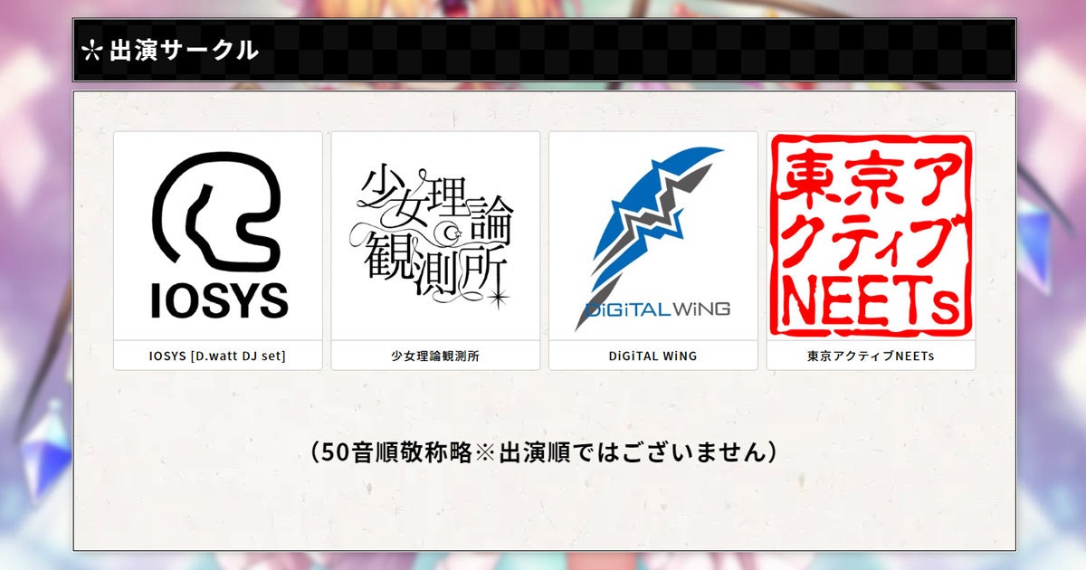今回「 IOSYS [D.watt DJ set] 」「 少女理論観測所 」「 DiGiTAL WiNG 」「 東京アクティブNEETs 」の4サークルが出演。東方Projectアレンジ音楽をお楽しみください。