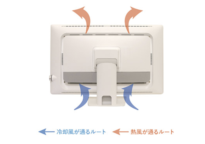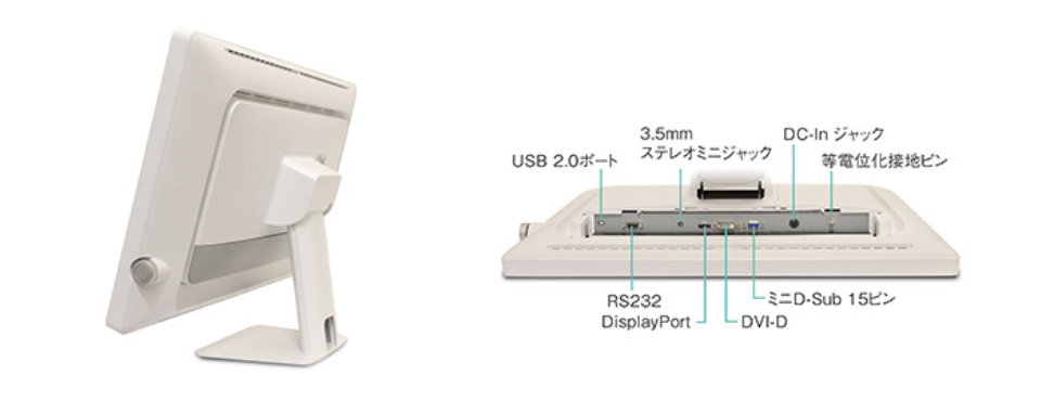 また、手狭になりやすい診察室での利用を想定し、モニター背面にはコード類を簡単に収納できるケーブルマネジメントホールを装備しています。さらにスタンド部分は金属を使用することにより安定感を実現。本体が揺れにくいだけではなく、漏電を防ぐ機能も備えています。モニター背面のカバーやディスプレイ四隅は丸みを帯びた形で設計されているため、不意にぶつかった際にも安心です。デスクの上や診察台の上など、見る角度に合わせて上30°下5°の角度調整が可能です。