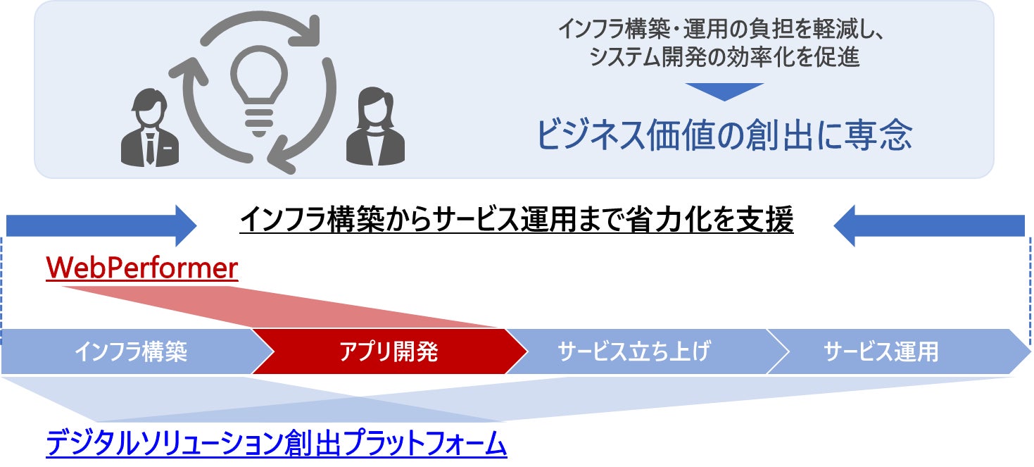 「デジタルソリューション創出プラットフォーム」はマネージドサービスとして提供されるため、インフラの構築・運用が不要になります。「WebPerformer」と組み合わせることで、開発から運用までのスピードが向上し、お客さまの要件に応じたアプリケーションを迅速に提供できます。