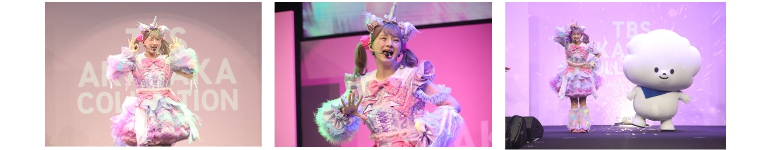 1部のアーティストライブには、原宿系動画クリエイターで、小中学生をはじめ若者から絶大な人気を誇るZ世代のカリスマ・しなこが登場。2024年3月に発売したアーティストデビュー曲『しなこワールド』、そして2025年10月にリリースした『ユニコーンパーティ』を「TBS AKASAKA COLLECTION produced by TGC」のオフィシャルフレンド、TBSグループキャラクターワクティとともスペシャルパフォーマンス。しなこらしいポップでカラフルな世界観で会場を染め上げました。