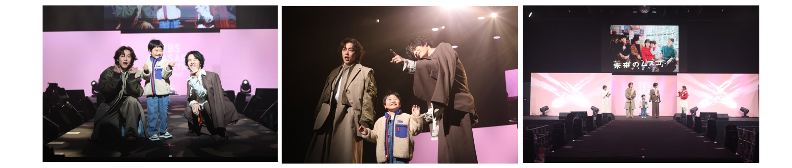 現在放送中の火曜ドラマ『未来のムスコ』から塩野瑛久・吉村界人・天野優が登場!3人そろって、ランウェイトップでは指ハートを作ってニッコリ。その後のトークパートでは、シークレットゲストとなった颯太役の天野優が「面白かった!」と、早速ランウェイの感想を。さらに、今回のテーマ「SWEET AKASAKA」にちなみ、撮影中のSWEET & BITTERなタレコミエピソードのトークを展開しました。まずは、塩野瑛久が「優くんが顔をあわせると、ワーッと駆け寄ってきてくれるのがSWEETなんですが、ハグすると頭がちょうどみぞおちにガンと当たるのがBITTER」と語ると、吉村界人は「昼休憩も劇団員役の男性陣が自然と同じ楽屋に集まってくる。本当に仲良しなんです」とSWEETなエピソードを披露しました。さらに塩野瑛久と吉村界人には、共演者からのタレコミも!志田未来から「役に入り込みすぎているのがBITTER。その一方で優くんといつもじゃれあっているのがSWEET」と、小瀧望から「裏でまとめ役になっているのと趣味のカメラで誰かを撮影している横顔がBITTER。見つめ合うシーンで思わず照れてしまうくらい顔がSWEET!」とタレコミされた塩野瑛久は、「劇団の座長という役なので気合いが入ってしまっているんですよね」と照れ笑い。また、吉村界人も兵頭功海から「『兵頭はとがっているからな』といじられるんですけど、ご飯を食べに行ったときに『兵頭はダメなところなんてない』と言ってくれたのがうれしかった」というエピソードが届き、「普通に言うことじゃないですかね」と照れくさそうな笑顔を見せました。そして、トークパートの最後には塩野瑛久が「今日はお会いできたいい機会なので、これをきっかけに『未来のムスコ』を観ていただければ。この物語の優しさに触れてください」と、吉村界人が「途中からでも楽しめる作品ですので、ぜひ観てください」と、改めて作品をPR。さらに、天野優が「ばいばーい。ドラマ観てね~!」と笑顔を見せ、スウィートな余韻を残しました。