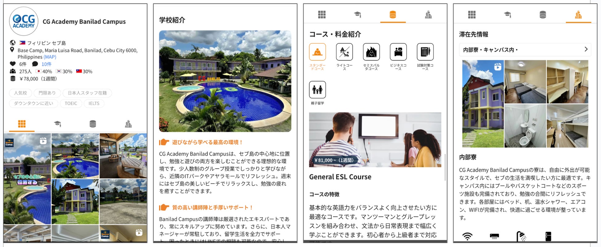 ネイティブキャンプ留学では、ユーザーが必要な情報を分かりやすく把握できるよう、常に丁寧で明確な情報提供を心がけています。CG Academyの詳細情報は、以下の4つのカテゴリーに分けて掲載しており、知りたい情報を的確にお届けします。