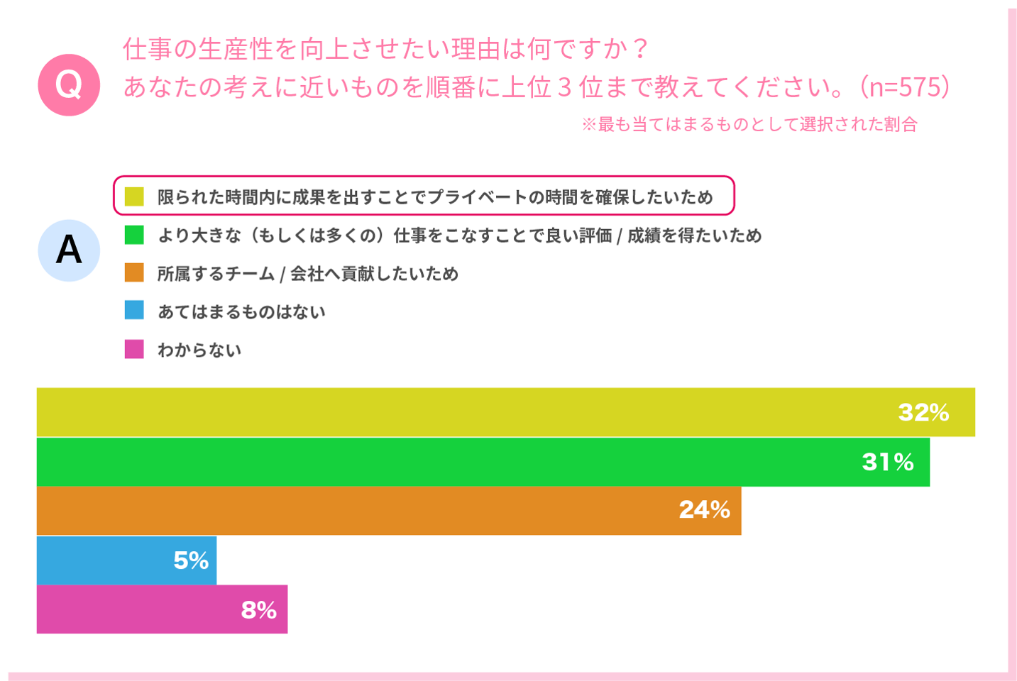 ワークショップと合わせて実施した調査(※)で、若者に生産性を向上させたい理由を聞いてみると、1位は「プライベートの時間確保」という結果になりました。「良い評価/成績を得たいため」が僅差で2位になっていることからも、仕事とプライベートのどちらも重視したい考えを持っていることがわかります。限られた時間内で成果を出したいと思う若者は、仕事とプライベートを分けて考えるのではなく、どちらも自分の生活としてトータルでとらえメリハリのあるタイムパフォーマンスを意識することで、日常生活全体を豊かにしたいと考えていました。