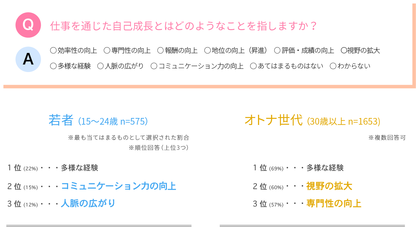 ※「仕事に求めることを教えてください。」という質問に対し「自己成長ができる」と回答した若者男女計575名、オトナ世代男女計1653名に対する調査。
