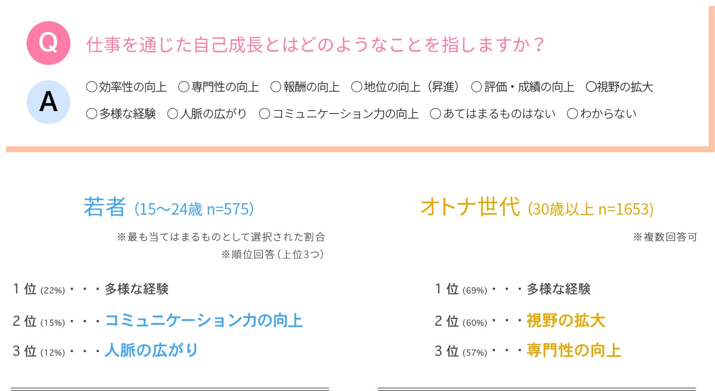 “成長”の捉え方は世代によって異なっており、若者にとって自己成長に必要なことは、周囲とのつながりを大切にしつつ、自分が納得してやりたいことをできているかどうかということがわかりました。