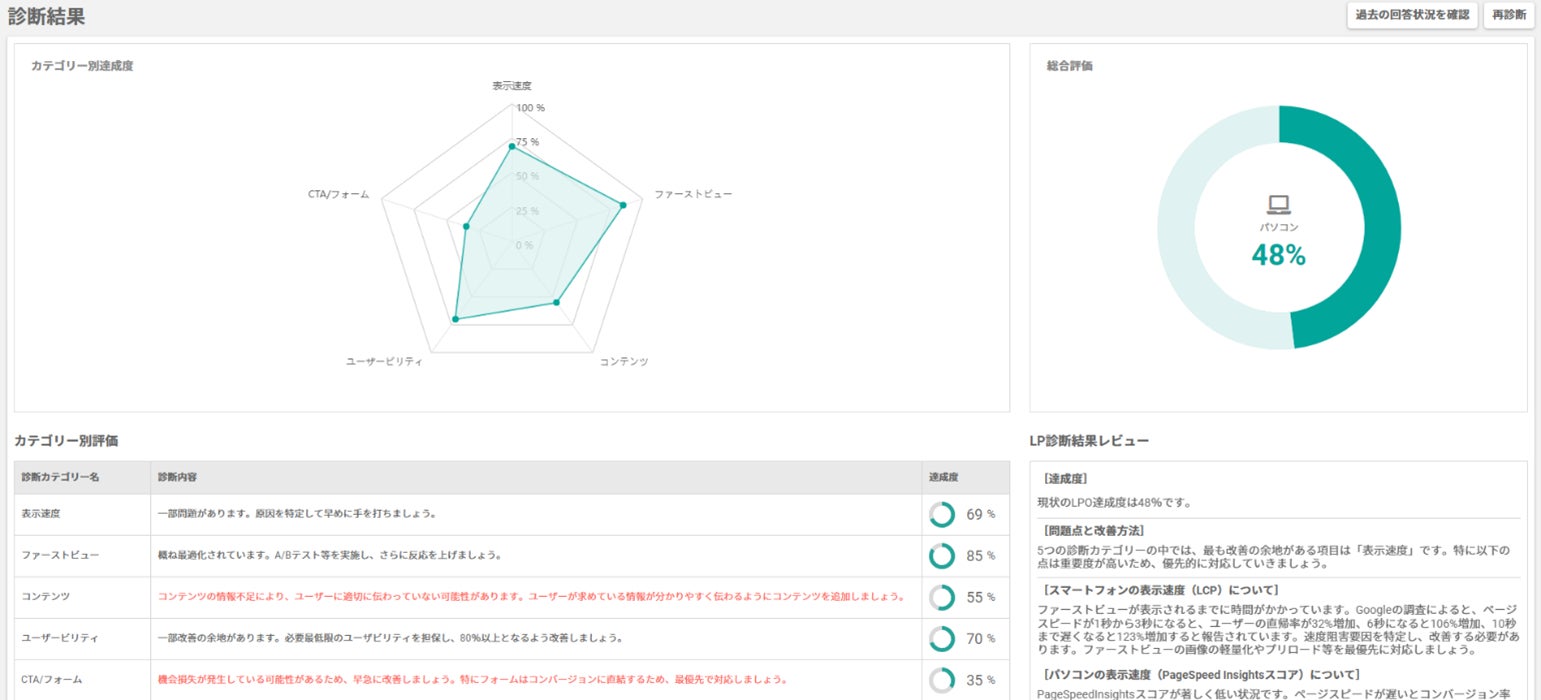 診断対象のランディングページに対して、ライティングやユーザビリティなどに関する全50項目以上の観点から、独自のアルゴリズムによって多角的に診断を行うツールです。