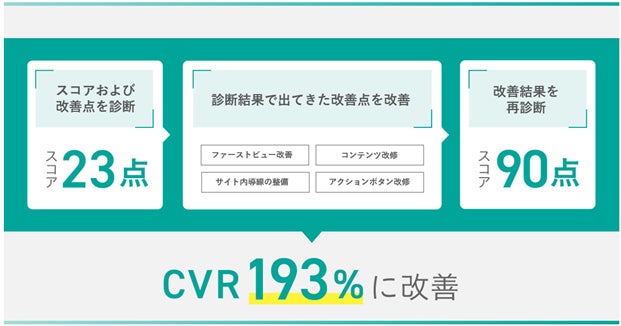診断結果に基づいて、ファーストビューの改善、ライティングページ内のコンテンツ改修、サイト内導線の整備、アクションボタンの改修などを行い、CVR(コンバージョン率)が193 %に改善。