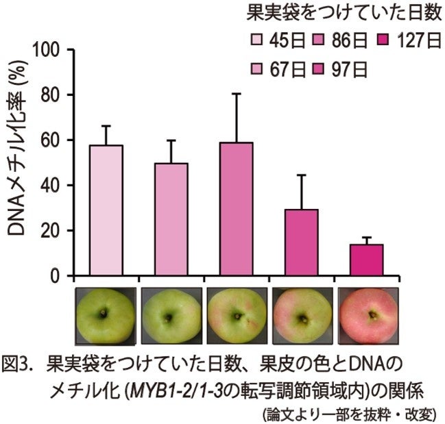 しかし、この現象は突然変異のようにDNA情報が変化するわけではないため、どのように眠った状態のMdMYB1-2やMdMYB1-3のスイッチがONになるのか、という新たな疑問が生まれました。そこでDNAの化学構造の変化である、メチル化(注2)を調べたところ、MdMYB1-2やMdMYB1-3のDNAの一部で、果実袋によりDNAのメチル化が低下(図3)することで、MdMYB1-2やMdMYB1-3遺伝子が目覚めることを‘陸奥’で発見しました。