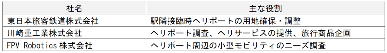 本取組みでは、JR東日本、川崎重工、FPV ROBOTICSを含む計9団体が参画し、「駅と空をむすぶ『空飛ぶクルマ』の事業検証」をテーマに検討を進めてきました。
