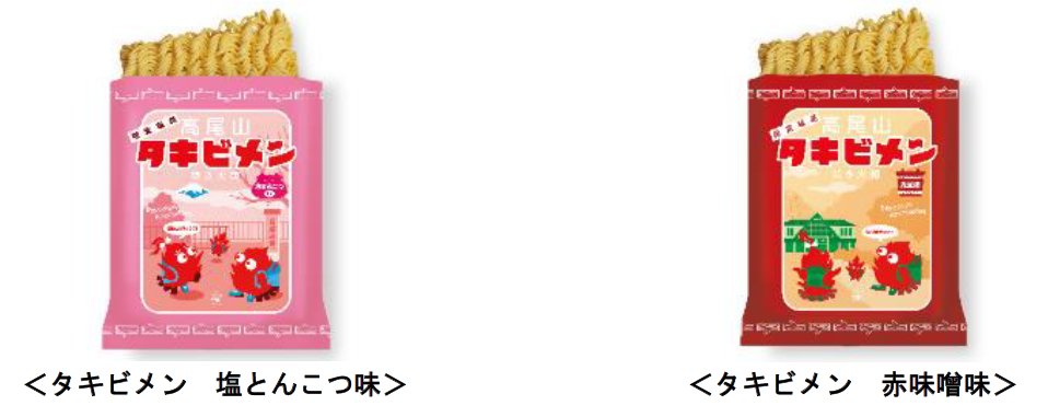 高尾登山をイメージした限定オリジナルパッケージ2種類の袋麺を各100円(税込み)で発売します。塩とんこつ味は、高尾山山頂から富士山が臨める様子、赤味噌味は、高尾山の麓にあるケーブルカー・リフトの駅前広場の様子が描かれています。