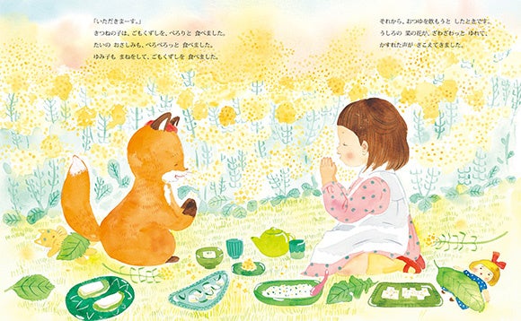 ある日、ゆみ子が菜の花畑の道を歩いていくと、きつねの子の歌声が聞こえてきました。