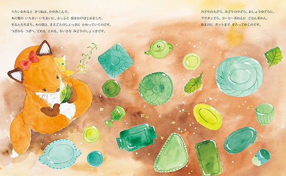 きつねの子の木の葉の食器も、いろいろな緑色、形で描かれていて楽しくなりました。
