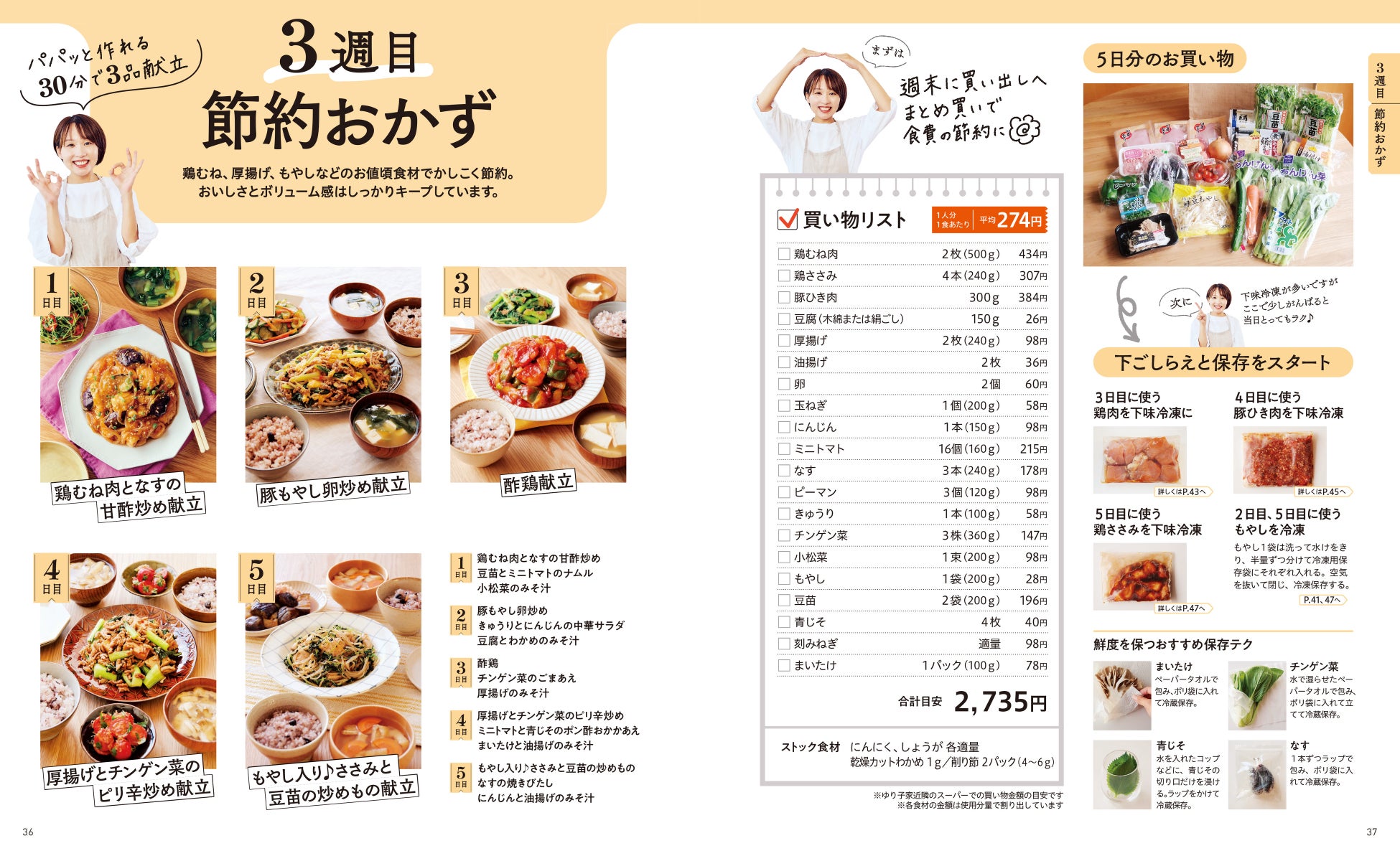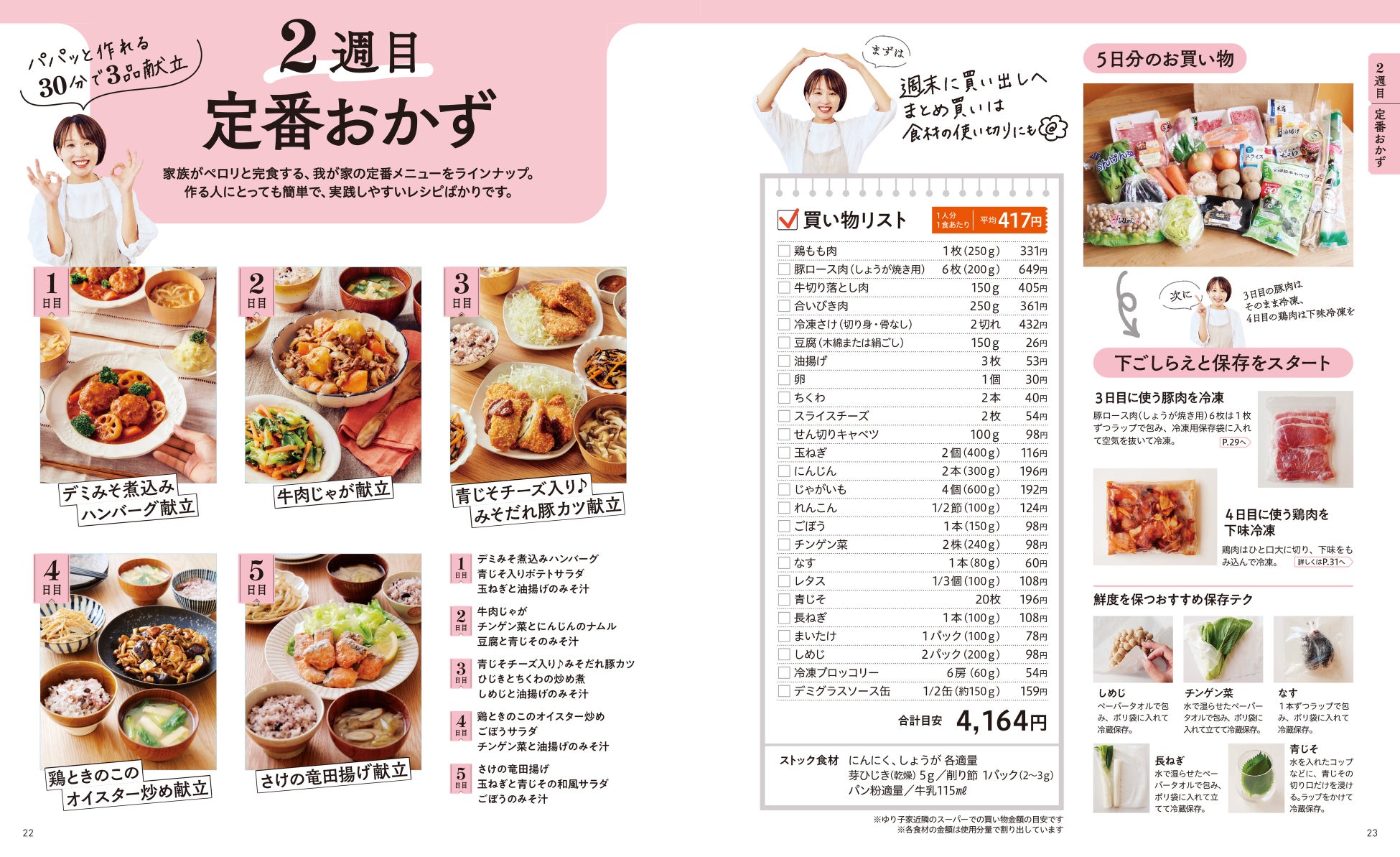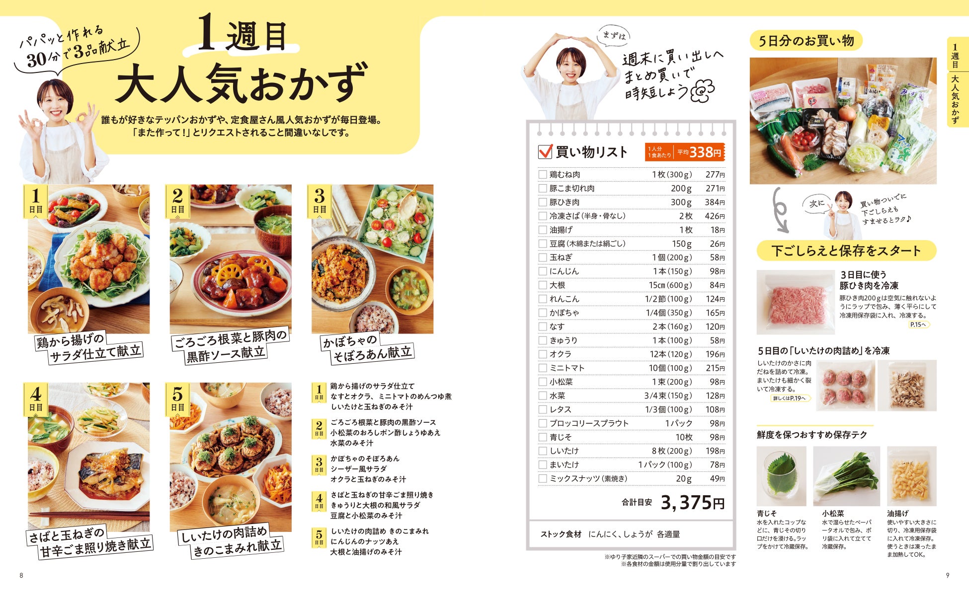 この本では平日5日分のお買い物リストと下ごしらえ、献立をセットで紹介しているのでマネするだけで簡単、時短、ボリューム満点な献立を作ることができます。
