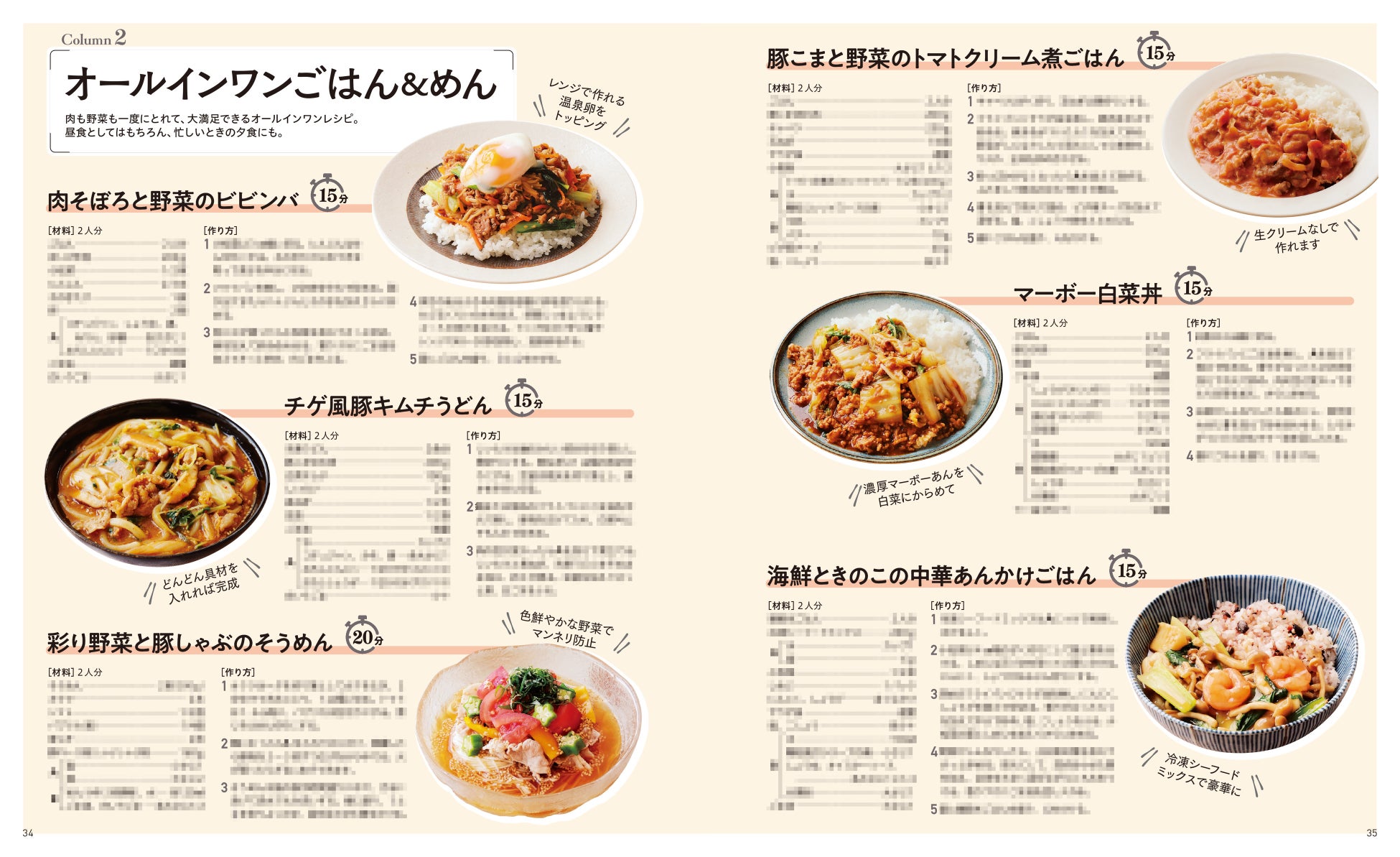 肉も野菜も一度にとれて、大満足できるごはんやめんを使ったオールインワンレシピも紹介しています。昼食や忙しいときの夕食にもぴったりです。