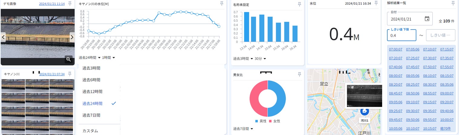 Webシステム機能を担う「プラットフォーム」をベースに、独自開発画像解析AI「クラウドAI」と「エッジ AI」を加えた3つの要素で構成されます。「プラットフォーム」は、Web APIによる画像や数値データの登録/配信機能を提供しており、利用者が開発したAI解析結果の受信も可能です。「プラットフォーム」が受信したデータはデータストアに保存され、ブラウザ上のダッシュボードから手軽にグラフィカルにデータを閲覧することができます。また、「クラウドAI」に搭載の煙検出AI機能や「エッジ AI」に搭載の水位測定AIを防災用途に利用することが可能です。