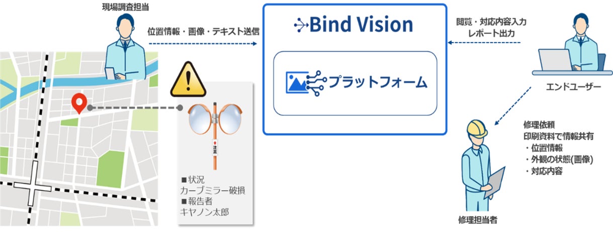 これまで、防災用途での使用時に受信するアラート通知に基づく被災状況や対策状況の記録といった業務のデータ管理は、別のシステムが必要でした。今回のカスタムマップ機能追加により業務のデータも「Bind Vision」で一元管理が可能となり、業務の効率化と情報の一貫性向上を促進します。