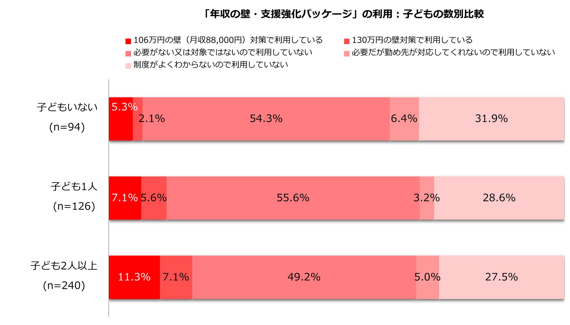 年収の壁対策として政府が行っている「年収の壁・支援強化パッケージ」。開始から一年が経ったのを受け、仕事と家庭の両立を希望する主婦・主夫層に制度を利用しているかどうか尋ねたところ「利用している」と答えた人は14.6%でした。103万円や130万円などの収入上限目安があると答えた人だけに絞っても「利用している」と回答した人は25%超で、「利用していない」と答えた人が7割を超えました。約3割の人は「制度がよくわからないので利用していない」と回答しています。年収の壁をめぐる仕組みは複雑なだけに、そこに「年収の壁・支援強化パッケージ」が新たに制度として加えられたことでわかりにくく感じられてしまうのかもしれません。また、お子さんの数で比較すると人数が多いほど「利用している」比率が高くなりました。お子さんが多いほど生活費がかかる傾向にあるため、扶養枠に収めつつも年収の壁を超えて収入を獲得したいというニーズも高まりそうです。
