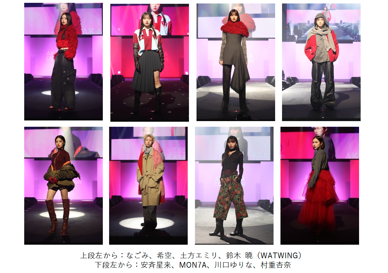 2部もTGCモデルが続々とランウェイを彩った「TGC AKASAKA COLLECTION」からスタート。2部のテーマは、「SWEET & SPICY RED」。トップバッターのなごみを始め、TGCモデルから希空、土方エミリ、鈴木曉(WATWING)、安斉星来、MON7A、川口ゆりな、村重杏奈が強さとかわいらしさを共存させるようなスタイリングで、バレンタインムードの赤坂を華々しく盛り上げました。