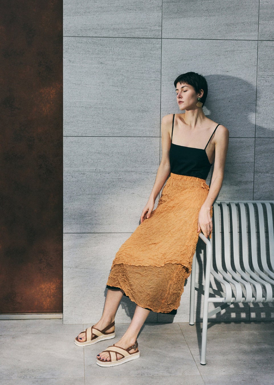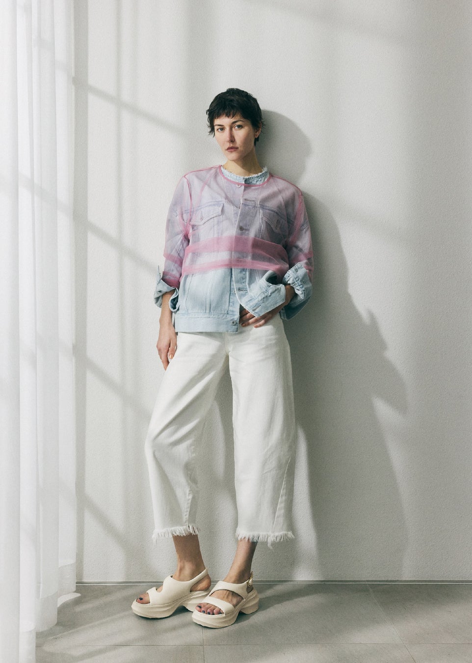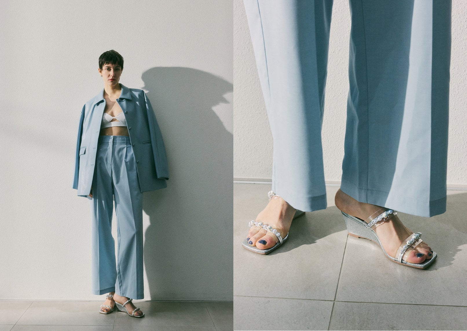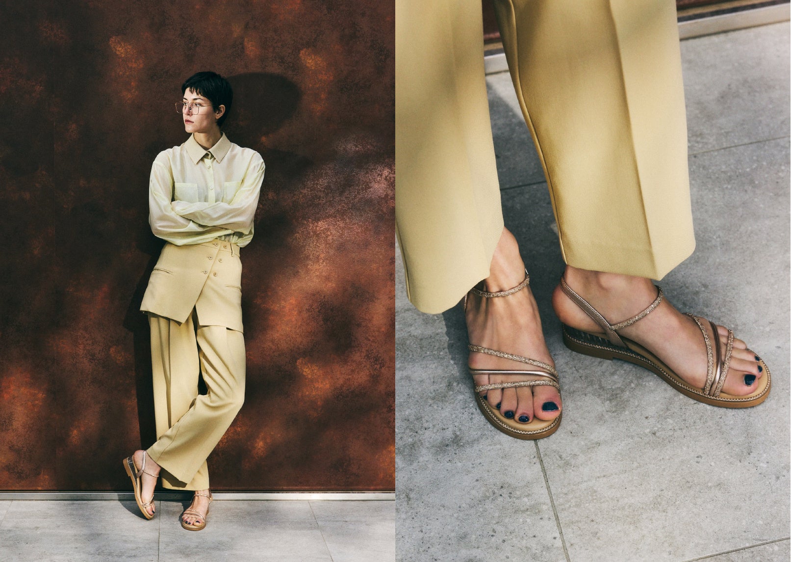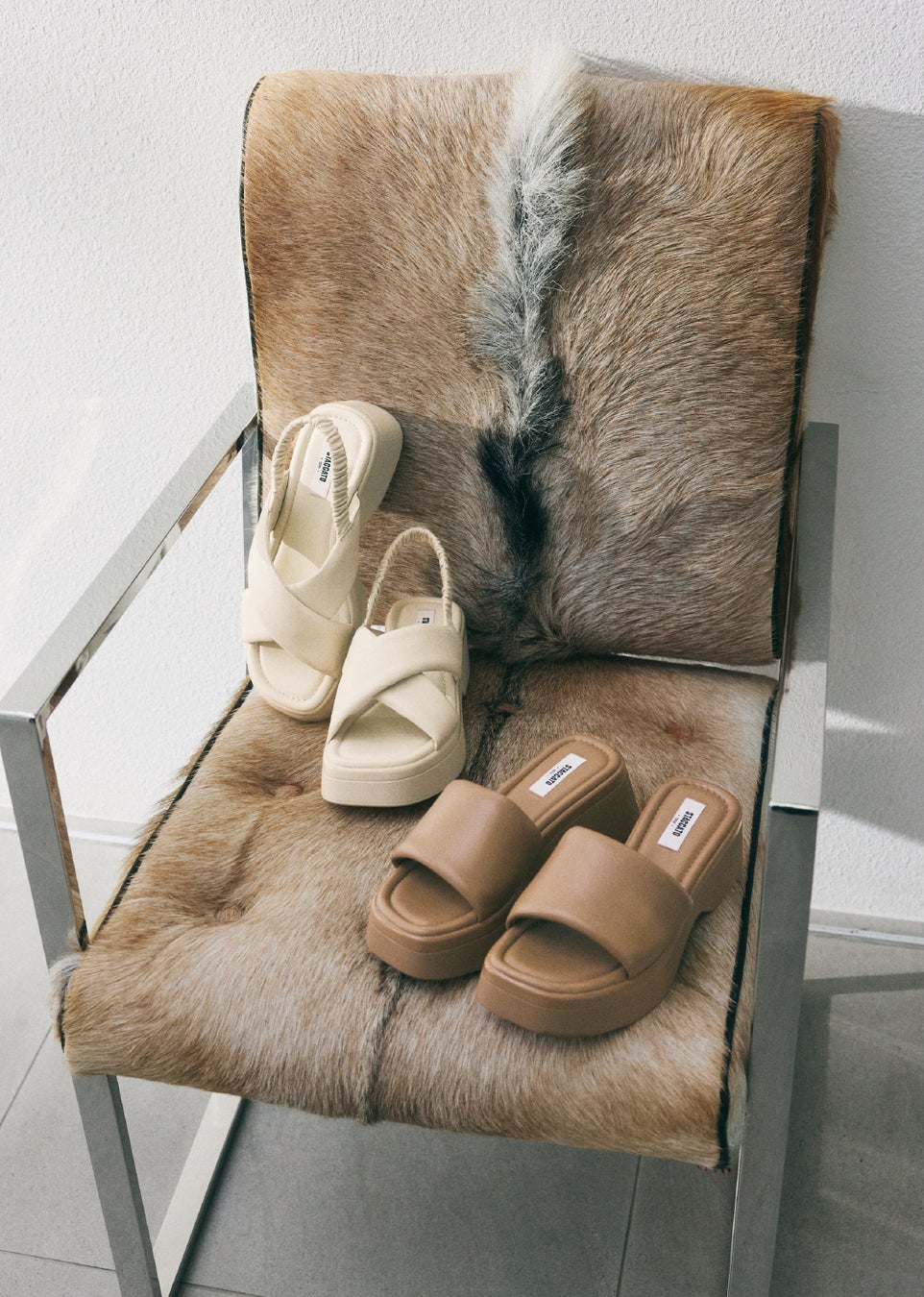 まるでプールサイドのような雰囲気に、窓から差し込む夏らしい日差し、モダンでエキゾチック感あるアニマルチェアなど、今夏のイメージを随所に散りばめ、夏ムードを盛り上げる演出に。またスタイリングでは、STACCATOのエッジの効いたサンダルに、夏らしい大人なカラー使いやレイヤードスタイルなどを合わせ、遊び心あるスタイリングを提案しています。