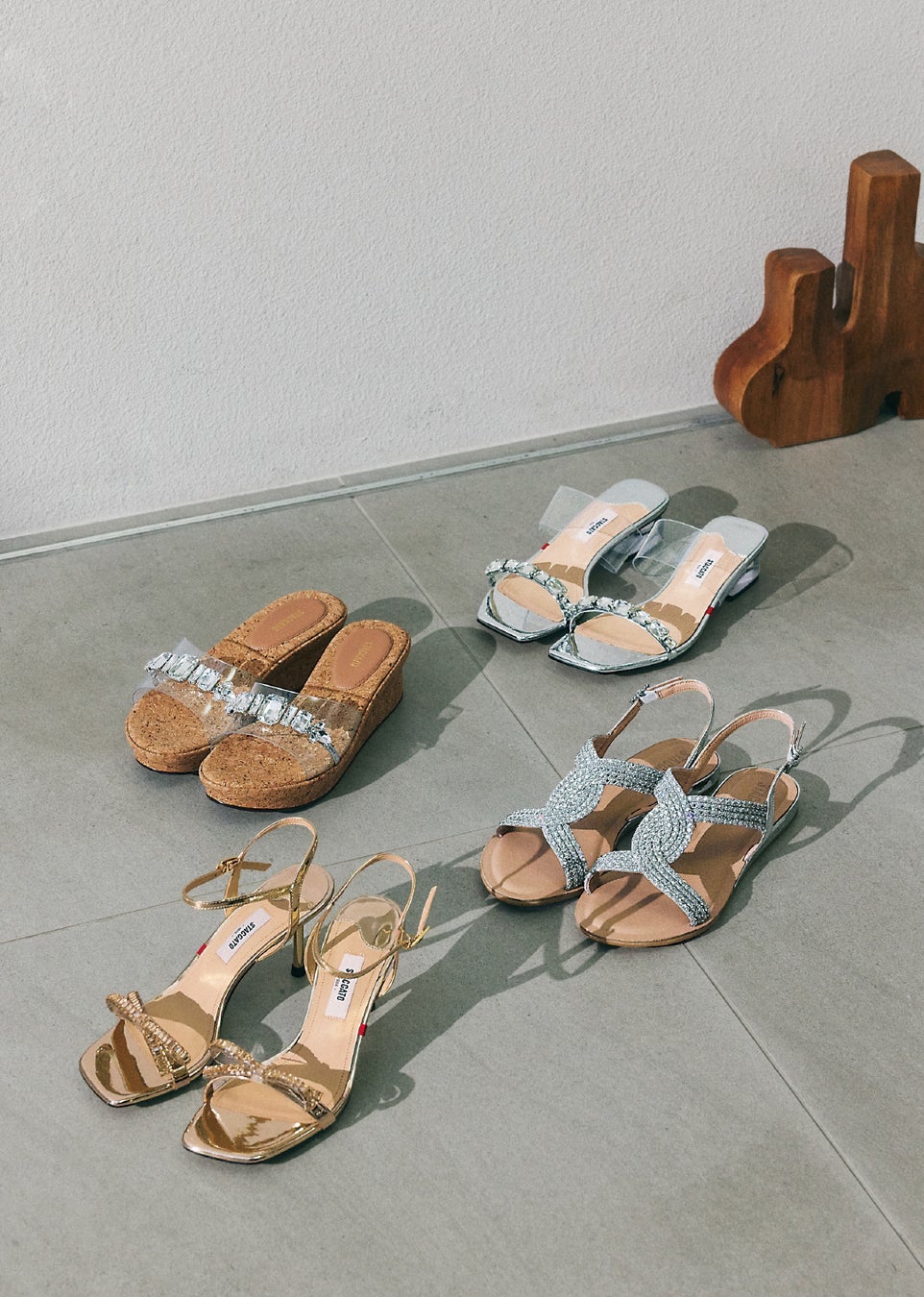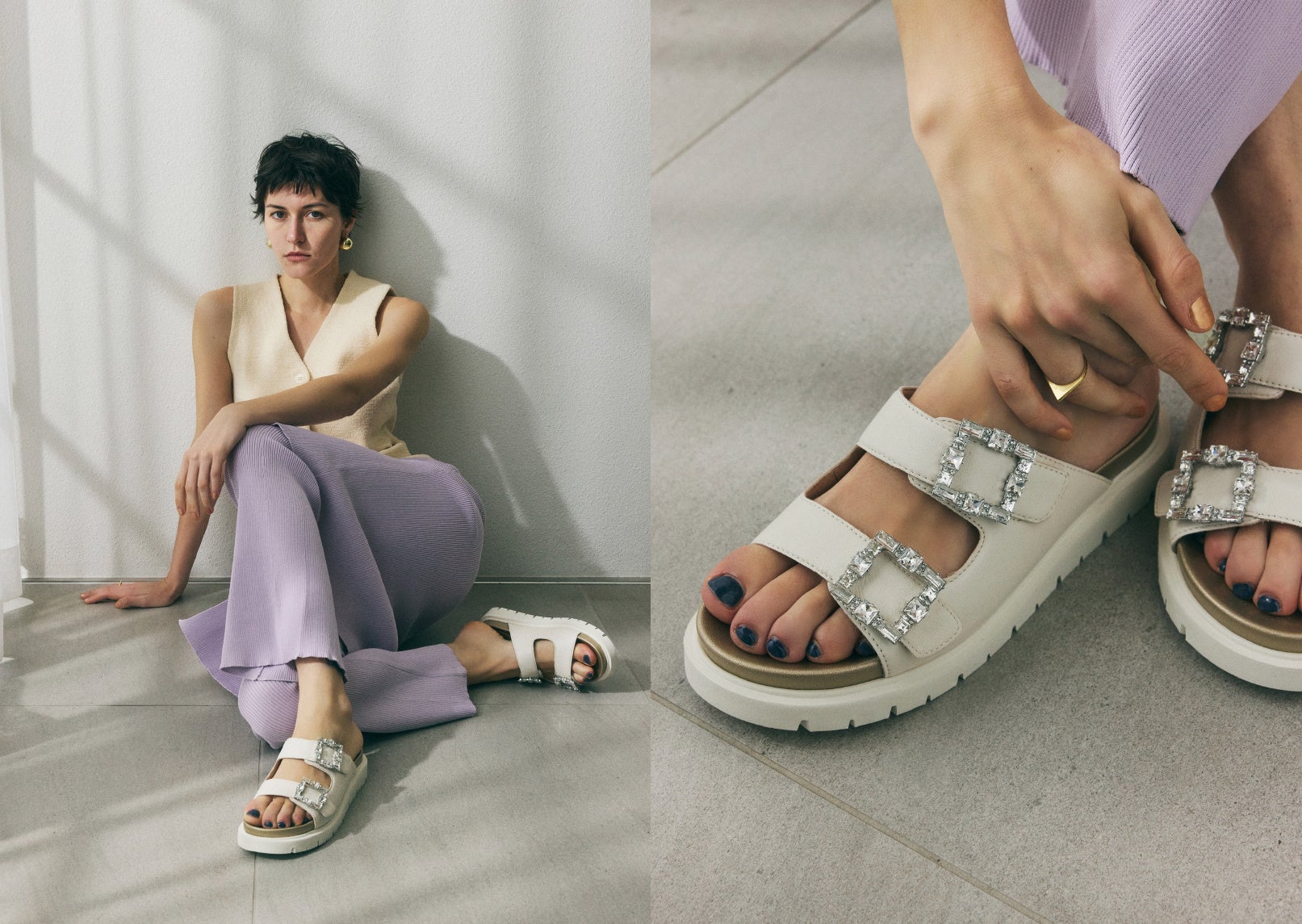 涼しげなクリアウェッジヒールに、歩くたびキラキラと光る華やかなストーンのコードストラップで、まるでジュエリーを纏っているかのようなデザイン。