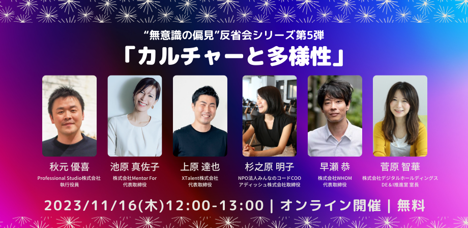 イベント登壇者 ※五十音順 | 秋元 優喜(Professional Studio株式会社 執行役員) 池原 真佐子(株式会社Mentor For 代表取締役、一般社団法人ビジネス・キャリアメンター協会 代表理事) 上原 達也(XTalent株式会社 代表取締役) 菅原 智華(株式会社デジタルホールディングス DE&I推進室 室長) 杉之原 明子(特定非営利活動法人みんなのコード COO、アディッシュ株式会社 取締役) 早瀬 恭(株式会社WHOM 代表取締役社長) |