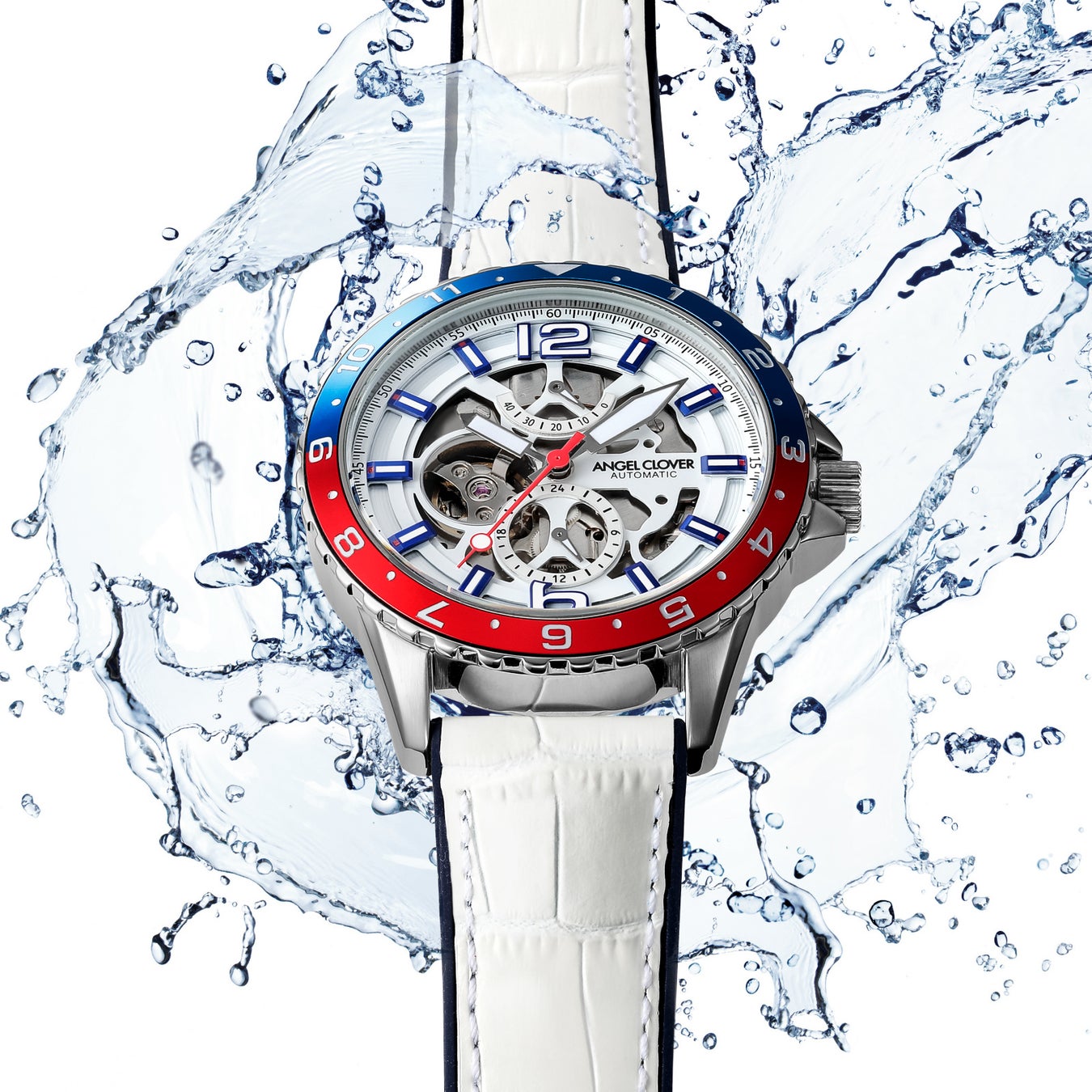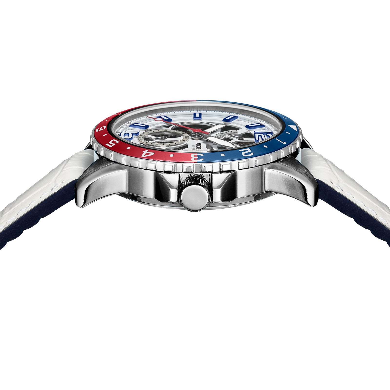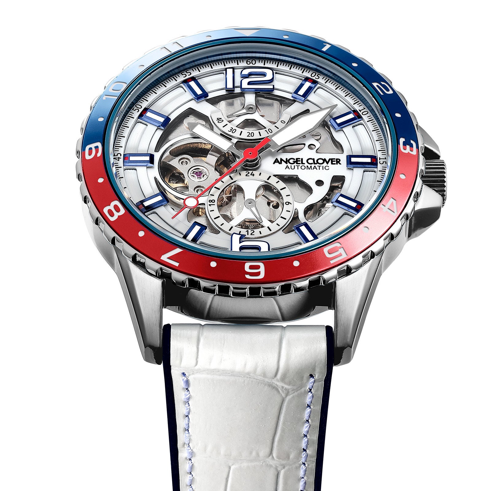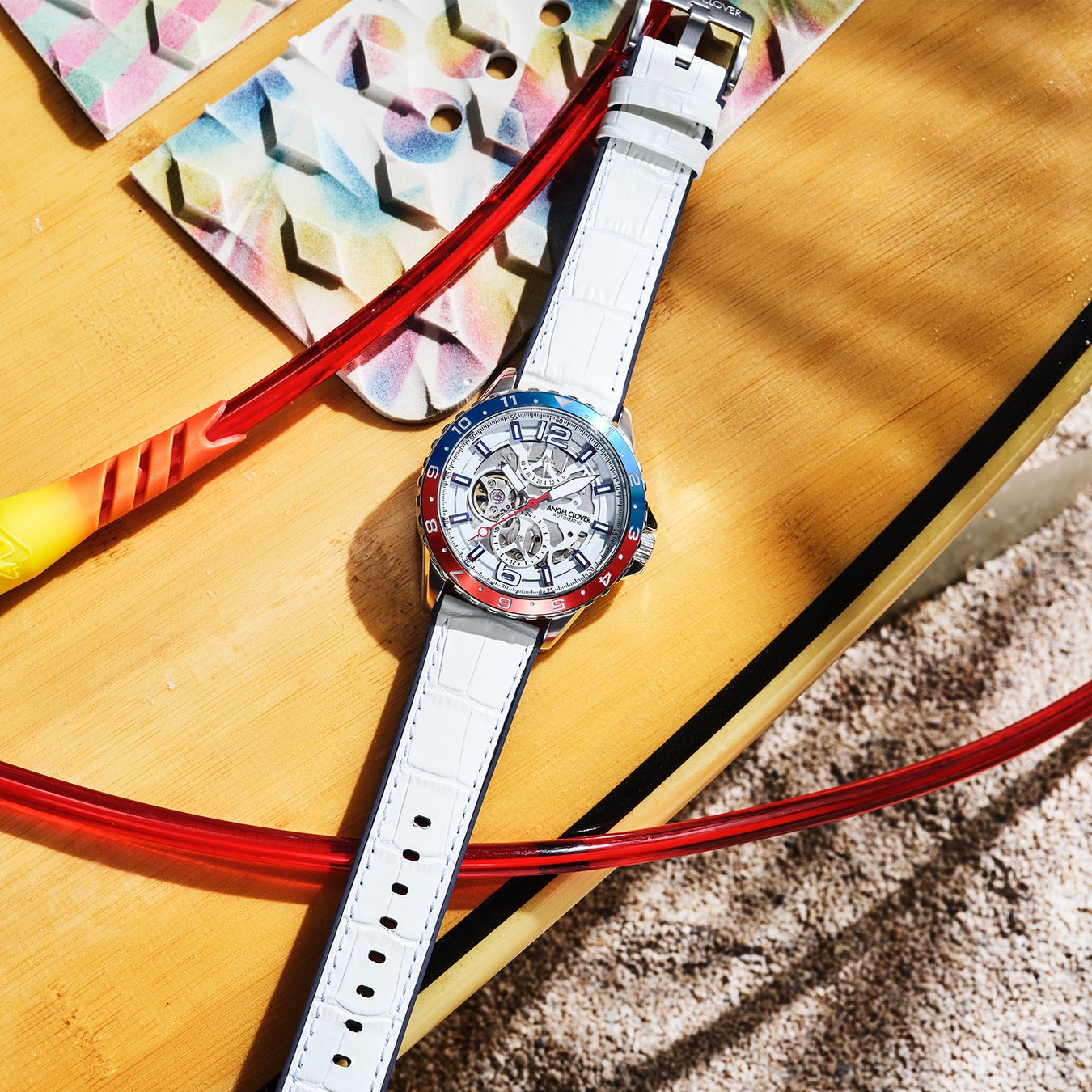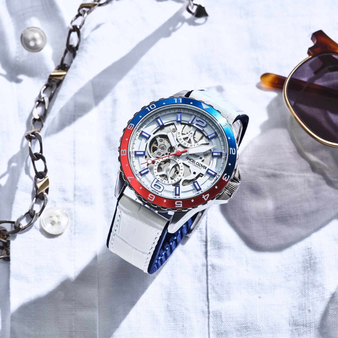 爽やかな印象の「白」ベースに、サンセットをイメージした「青」 ×「赤」のバイカラーベゼルを採用。