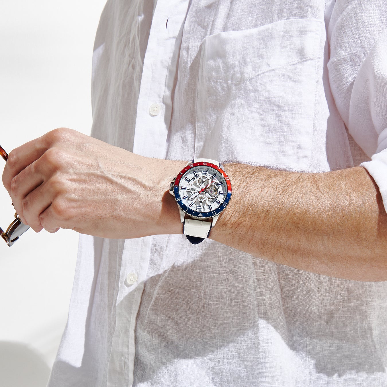 白ベルトのダイバーズウォッチは、春夏スタイルの代名詞ともいえる爽やかなリネンのホワイトシャツと抜群の相性。「青」 ×「赤」のコントラストを利かせたベゼルがサンセットビーチの雰囲気を感じさせ、アクセントになっています。