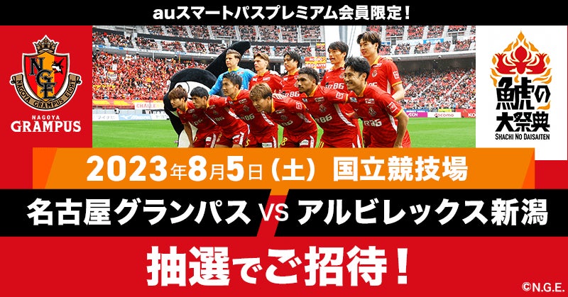内容:2023年8月5日19時から東京都の国立競技場にて行われる、Jリーグ「名古屋グランパス×アルビレックス新潟」に、 「auスマートパスプレミアム」会員限定の抽選で、1,000組2,000名様をご招待します。