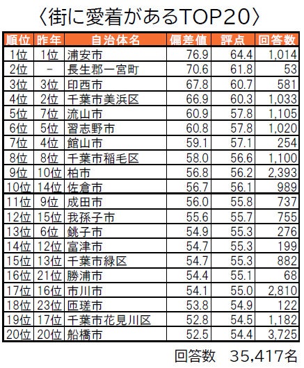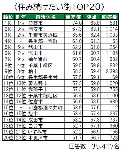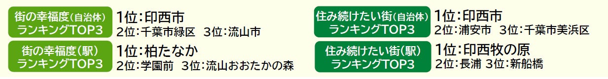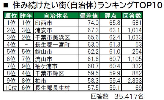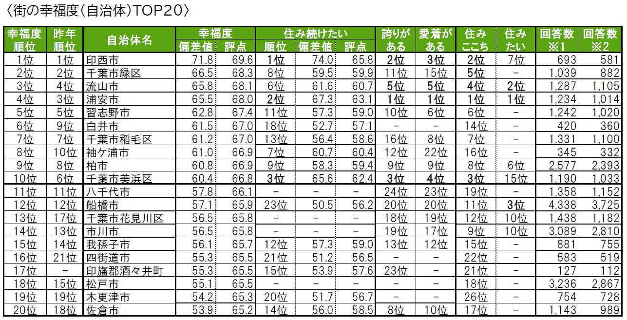 1位は3年連続で印西市で、唯一偏差値70台の高い評価を得ており、「街の幸福度」でも1位となっています。2位は浦安市で、「住みここち」「住みたい街」「街に誇りがある」「街に愛着がある」の4つのランキングで1位、「街の幸福度」で4位の高い評価を得ています。3位は千葉市美浜区で、「住みここち」「街に誇りがある」の両ランキングでも3位、「街に愛着がある」で4位となっています。4位には、昨年は累計回答数が50名未満でランキング集計対象外だった長生郡一宮町が新たにランクインしています。