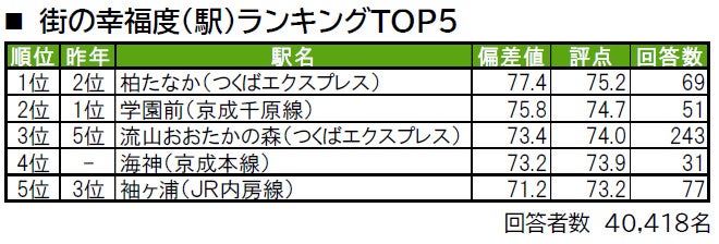 1位は、柏市に位置する柏たなか、2位は「街の幸福度(自治体)」で2位の千葉市緑区に位置する学園前です。3位は流山市に位置する流山おおたかの森で、「住みここち」でも3位、「住みたい街」では4位の駅です。4位は、昨年は累計回答数が30名未満でランキング集計対象外だった船橋市に位置する海神が新たにランクインしています。