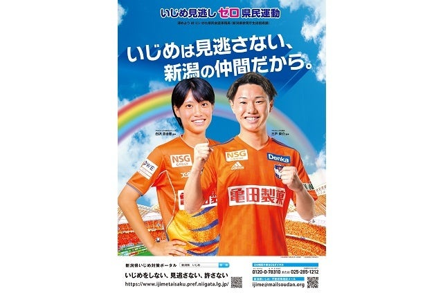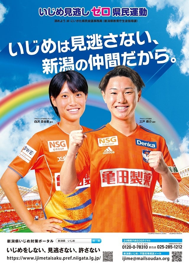このたび、新潟県教育庁生徒指導課(深めよう 絆 にいがた県民会議事務局)が「いじめ見逃しゼロ県民運動」の啓発のために展開するPRポスターのモデルとして、アルビレックス新潟 三戸 舜介 選手とアルビレックス新潟レディース所属の白沢 百合恵 選手が初めて起用されることとなりましたので、お知らせいたします。また、本運動の個人サポーターに両選手が登録いたしましたので、併せてお知らせいたします。