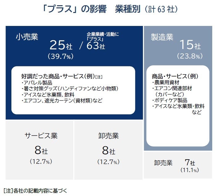 プラスの影響を開示した63社を業種別にみると、「小売業」(25社)で最も多く約4割を占め、Tシャツなど夏物衣料を中心としたアパレルや、猛暑対策グッズなど雑貨類の売れ行きが好調だった雑貨店が目立ち、販売ペースに在庫が追い付かないといったケースもみられた。「製造業」(15社)は、アイスや飲料品などの生産に加え、エアコン関連部材やボディケア製品など猛暑対策グッズが好調といったプラス影響があったほか、関連する新商品の開発も活発だった。「サービス業」(8社)は、屋内レジャー施設や屋外作業代行などで好影響となった。