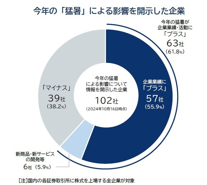 株式会社帝国データバンクは、国内の各証券取引所に株式を上場する全企業を対象に、2024年10月16日までに「2024年の猛暑」について影響や見通しなどの見解について、適時開示資料などを中心に情報を収集・分析した。「プラス影響」「マイナス影響」は帝国データバンクの判断に基づく。