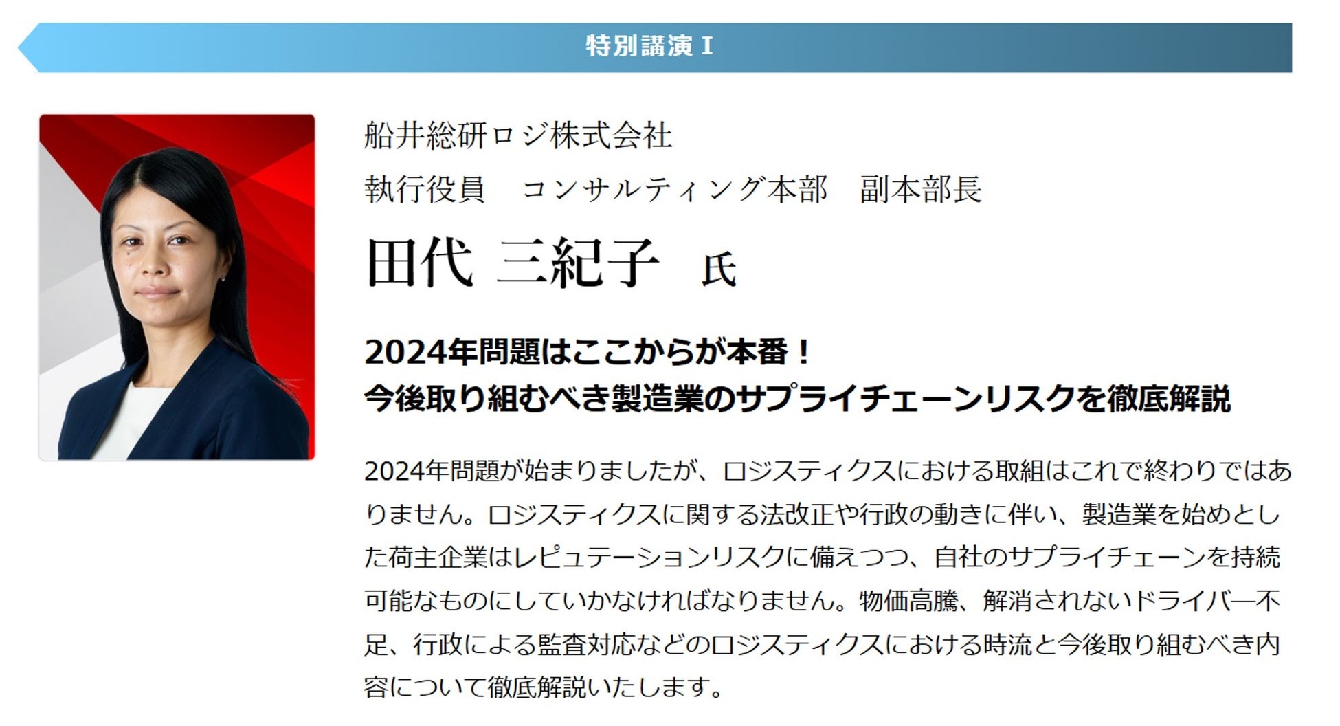 日本最大級の物流コンサルティングファーム 船井総研ロジ株式会社(大阪本社:大阪市中央区、代表:橋本直行、以下「船井総研ロジ」)のコンサルタント講演情報です。2025年2月13日(木)に開催されるオンラインセミナー『危機管理・リスクマネジメントフォーラム』にて、船井総研ロジ 執行役員 田代 三紀子が講演します。