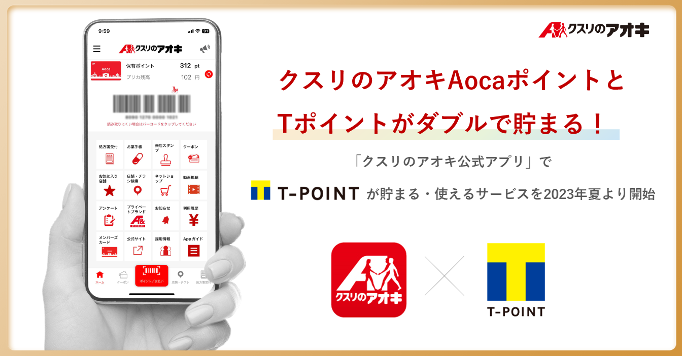 【クスリのアオキAocaポイントとTポイントがダブルで貯まる!】「クスリのアオキ公式アプリ」でTポイントが貯まる・使えるサービスを2023年夏より開始