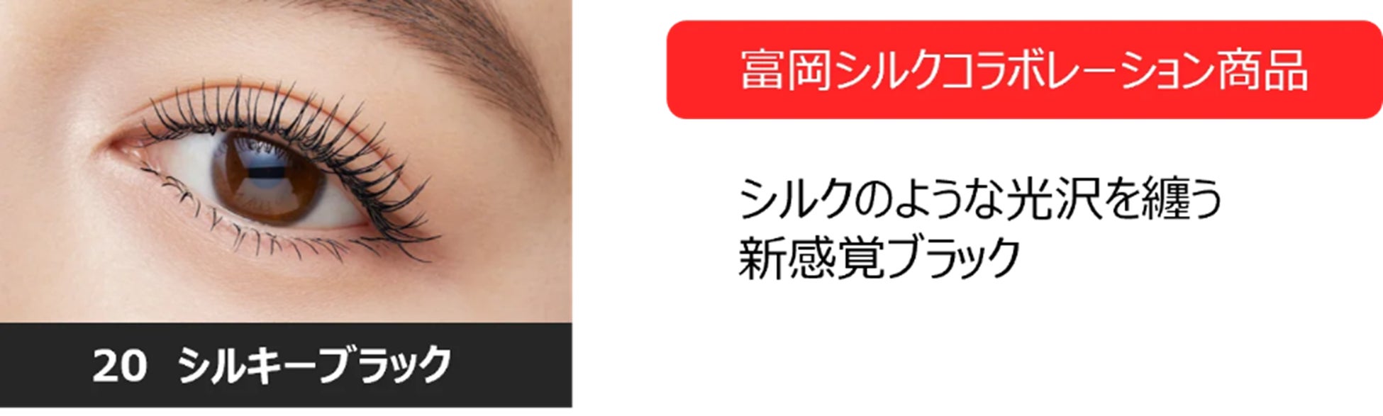 カールキープ&にじみに強いヒロインメイクの人気マスカラ『ロングUPマスカラ スーパーWP』から、ヒロインメイク20周年を記念した「富岡シルク」とのコラボーレーション商品が数量限定で登場中!なめらかさと艶感を叶える新感覚の「シルキーブラック」は、塗り重ねるほどにまるでシルクのような洗練された目もとを演出します。