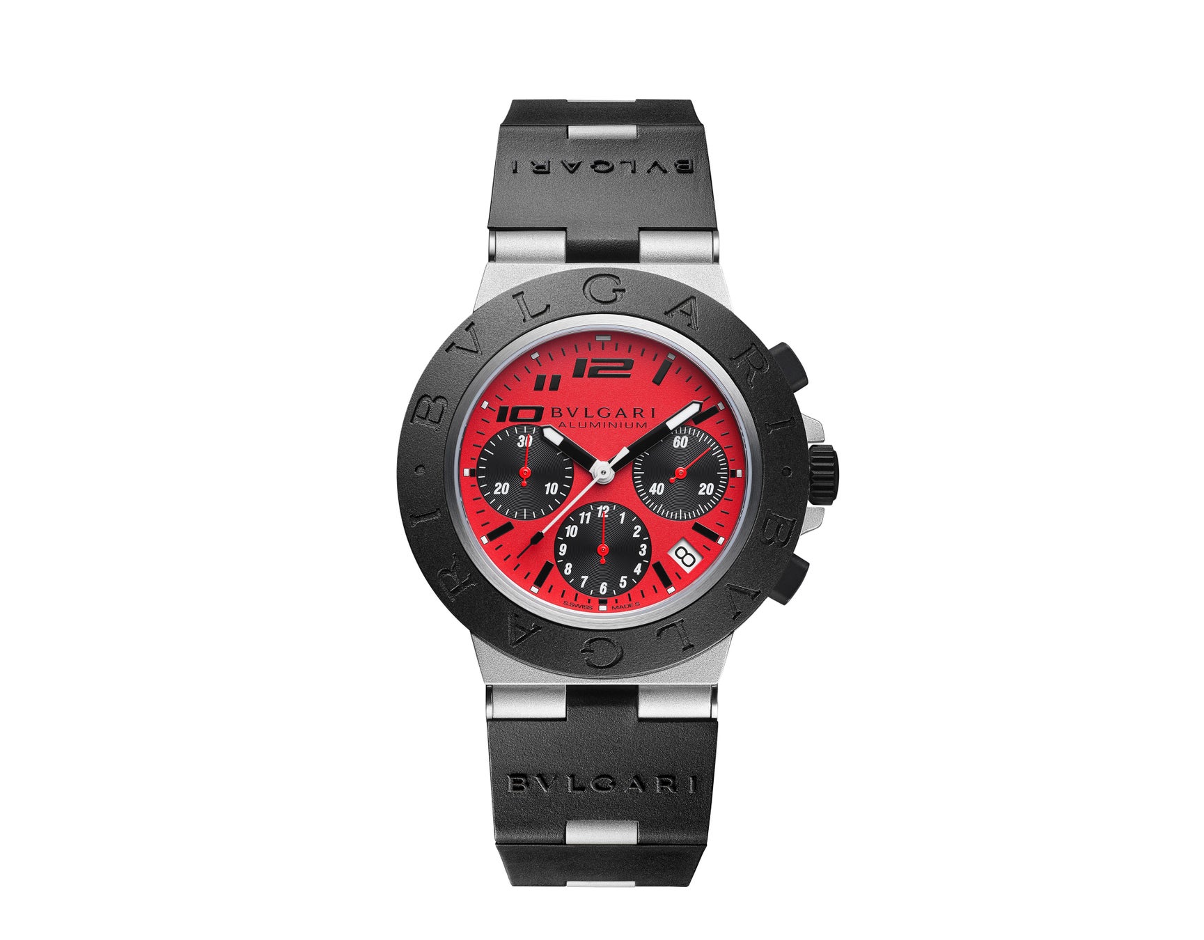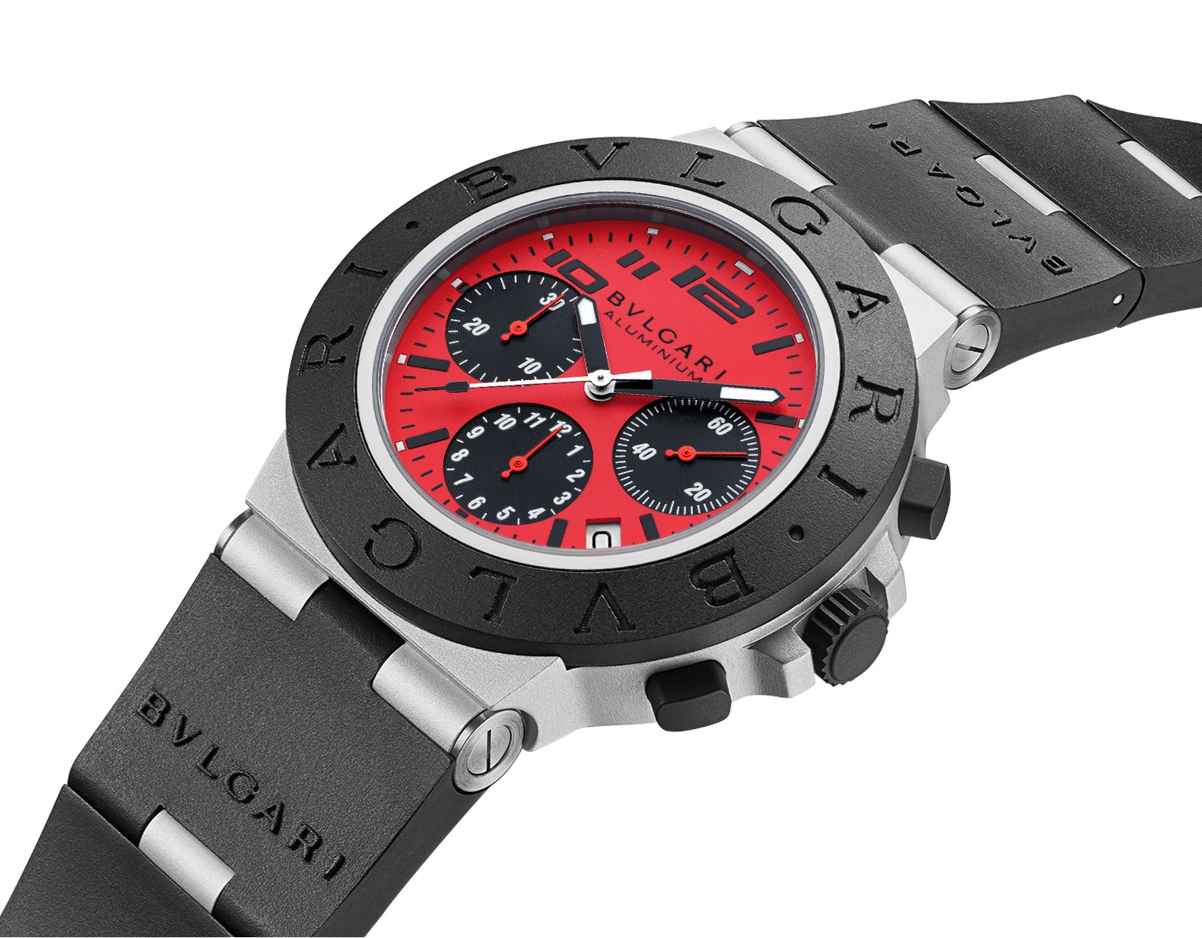 ケースはアルミニウム製、リューズとクロノグラフのプッシャーはチタン製。ラバー製のベゼルには、ブルガリ・ブルガリのダブルロゴがあしらわれ、アイコニックでデザイン性の高いしなやかなストラップがセットされています。