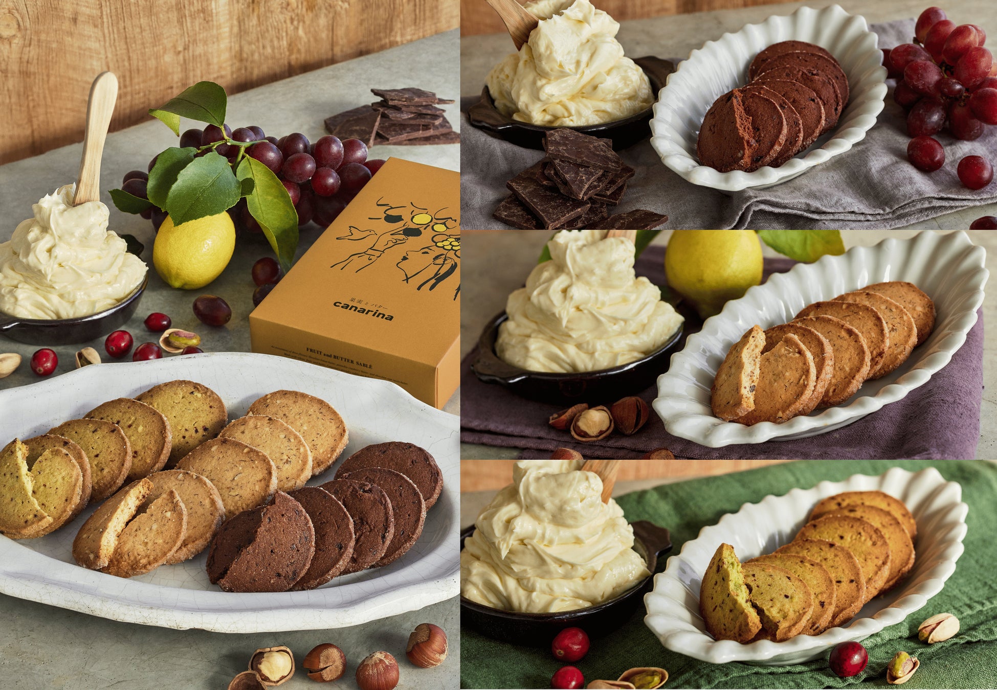 ヘーゼルナッツ シトロンバター・ピスタチオ クランベリーバター・ショコラ ラムレーズンバターの3種類の詰め合わせ。小麦に果実とバターを合わせ、さっくりと焼き上げた、食感や香り・素材を味わう、カナリナこだわりのサブレです。