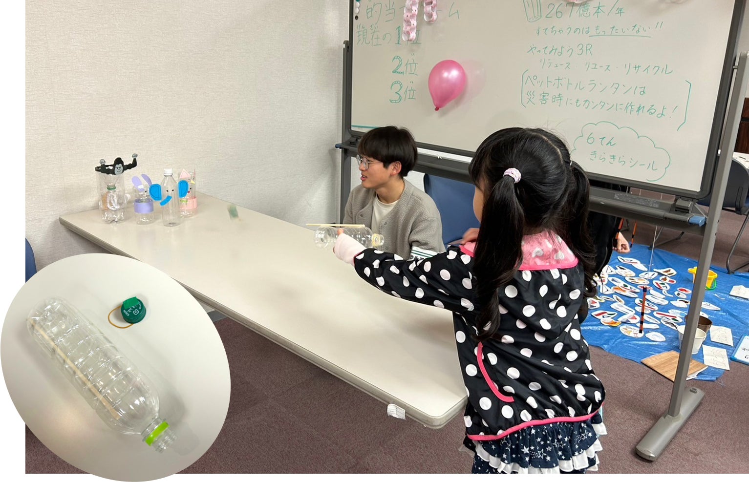 飲み終わったペットボトルを切って、好きな切り絵をアレンジして飾りつけ、LEDライトを入れて完成するランタンです。防災用にも使用できます。ワークショップはとても人気で用意していた50組分は午前中で終了しました。