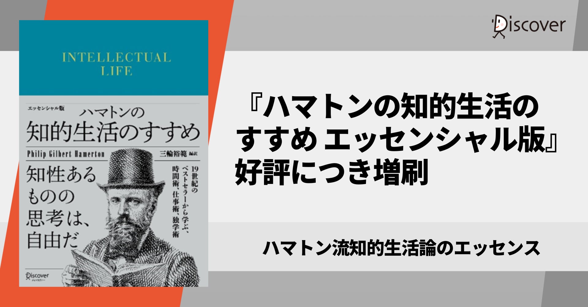 株式会社ディスカヴァー・トゥエンティワン(本社:東京都千代田区、取締役社長:谷口奈緒美)は2022年8月26日刊行の『ハマトンの知的生活のすすめ エッセンシャル版』(P.G.ハマトン 著、三輪裕範 編訳)を増刷しました。