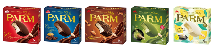 左から)PARM(パルム) チョコレート(6本入り)、PARM(パルム) チョコレート&チョコレート~厳選カカオ仕立て~(6本入り)、PARM(パルム) アーモンド&チョコレート(6本入り)、PARM(パルム) 抹茶(6本入り)、PARM(パルム) レモン香るチーズケーキ(6本入り)