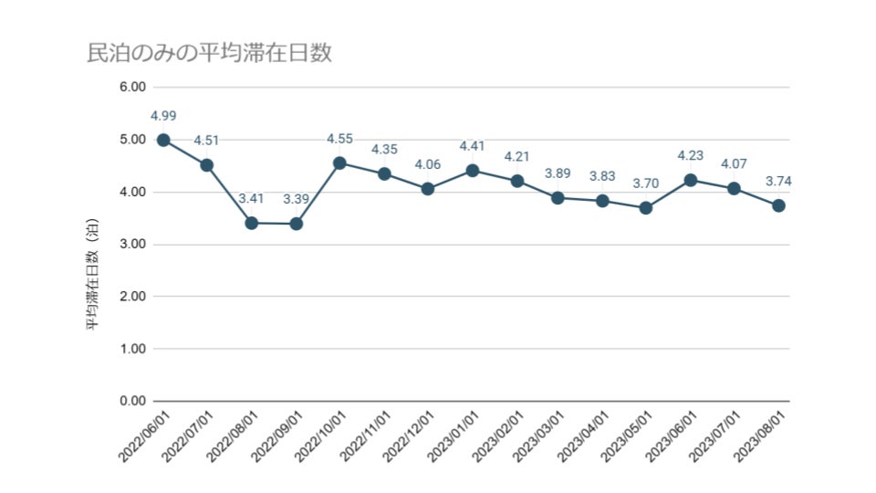 2023年6月に平均滞在日数が上昇して以降、先月に引き続き2か月連続で減少しています。夏休み期間を利用して、ショートステイで各地へ観光に行く、活発な動きと考えられます。