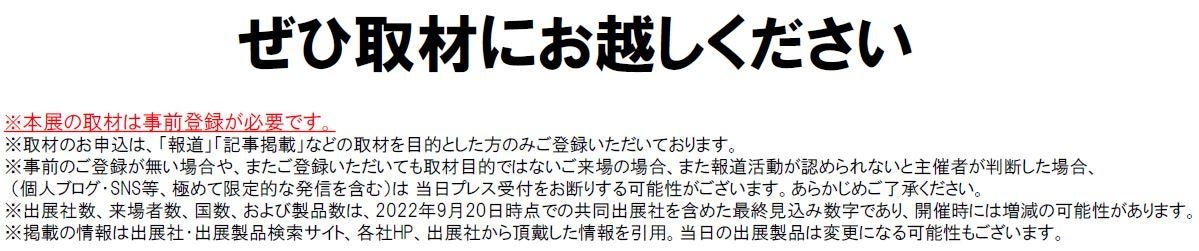 ※記載の出展社数・製品数・国数は、同時開催展を含む2022年9月20日時点での最終見込み数字であり、開催時には増減の可能性があります。