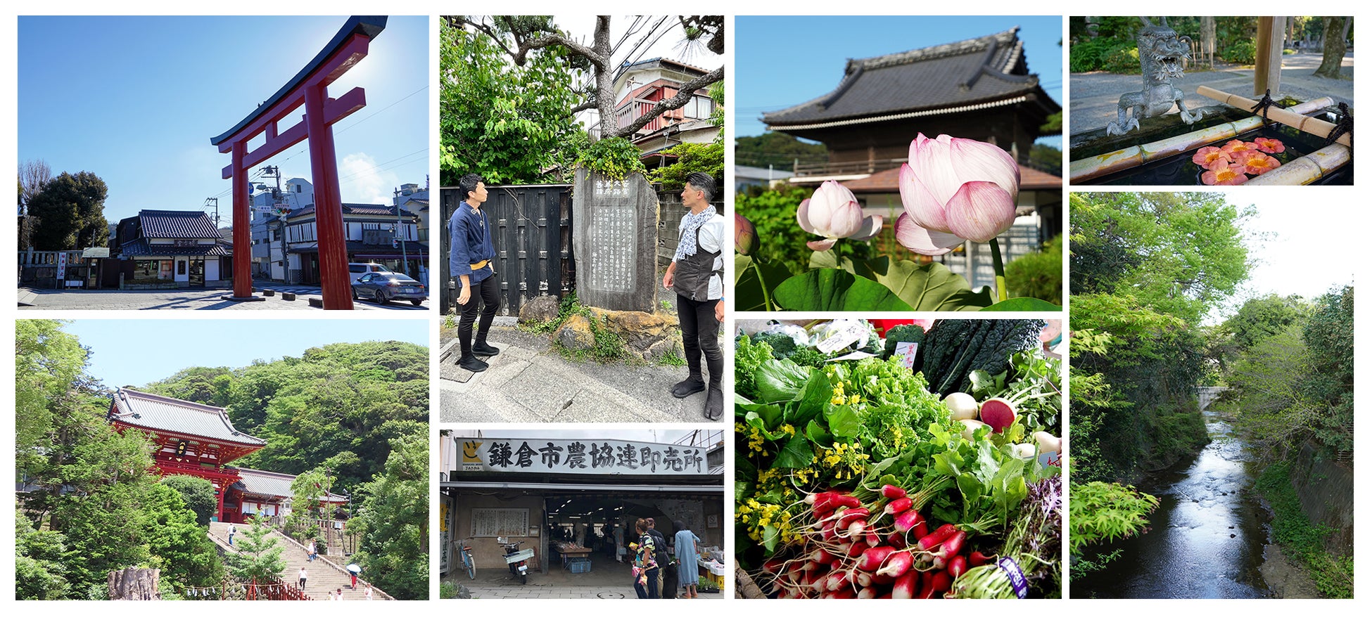 鶴岡八幡宮や本覚寺、妙本寺などのホテル近隣の寺社や、小町大路などの裏路地を、普段は人力車を曳きながら話す鎌倉の魅力や各スポットのうんちくなどをお客さまと共に歩いてご案内します。最後はレンバイ(鎌倉農協連即売場)で解散となりますので、新鮮な鎌倉野菜や朝ごはん巡りもお楽しみいただけます。