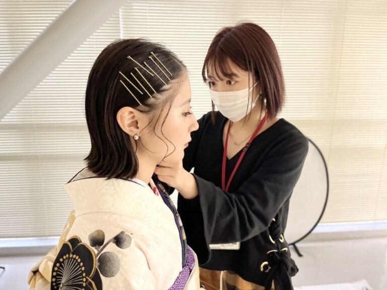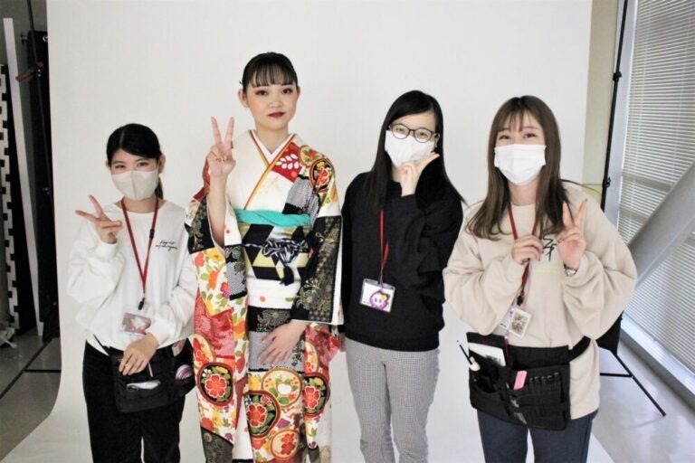株式会社アークベルは新潟、山形の庄内地方において冠婚葬祭関連のお手伝いを行っている会社です。今回の特別授業はビアンベールの振袖や袴を使用し、衣装のスタイリングやプロデュースに携わりました。