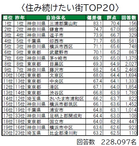 1位は神奈川県三浦郡葉山町で、「住み続けたい街」「街に誇りがある」「街に愛着がある」でも1位の高い評価を得ています。2位は、昨年1位だった埼玉県比企郡鳩山町です。3位は3年連続で東京都中央区で、「住みここち」は1位、「街に誇りがある」は5位となっています。